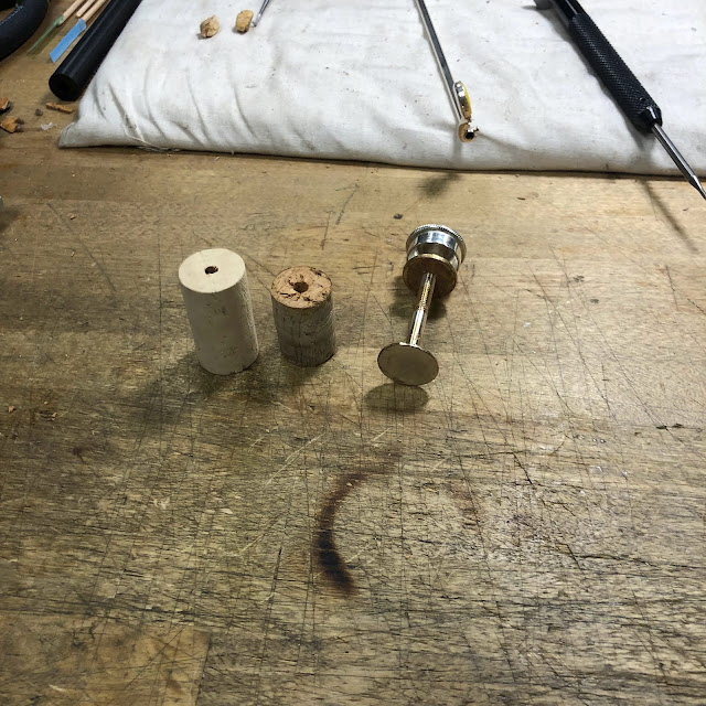 A self-made flute push rod is used to insert the cork. The silver scribe mark should line up with the center of the lip plate. This will measure 7mm from the plate to the center of the opening which sets the correct pitch.